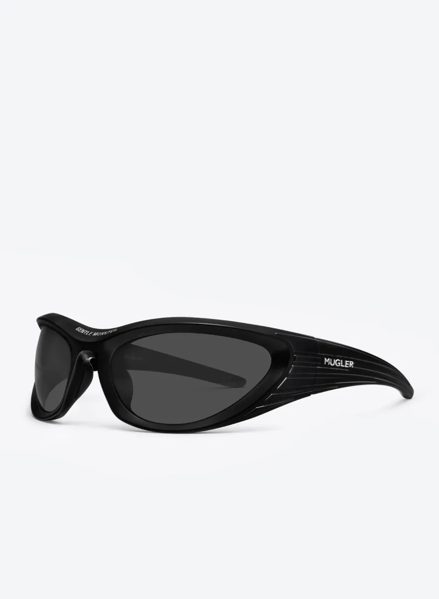 Discover the Spiral 02 M01 from the Gentle Monster X Mugler collaboration collection. A striking goggle-shaped frame and gray lenses blend seamlessly with the matte texture, adding a contemporary edge to this piece. The embossed line detail and chrome logo on the temples come together to form a powerful identity while the rubber nose pads behind the frame provide comfort.