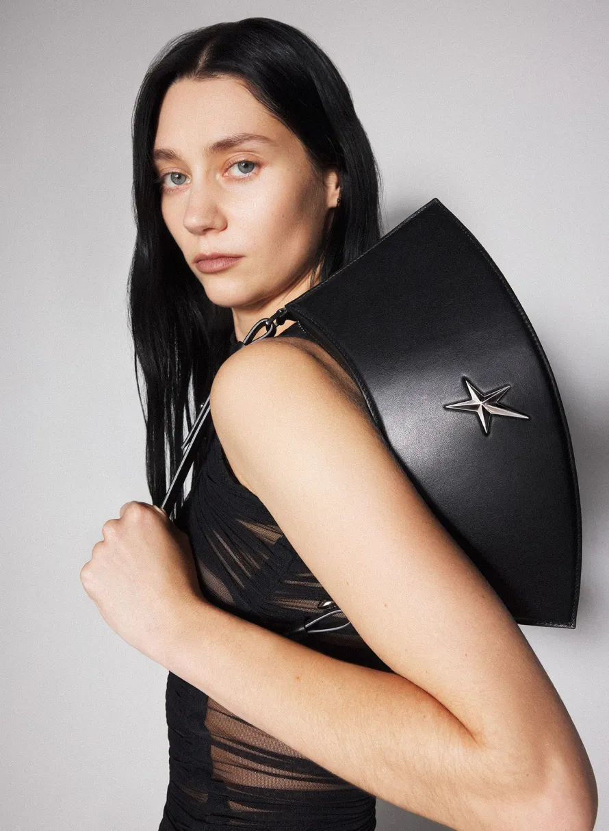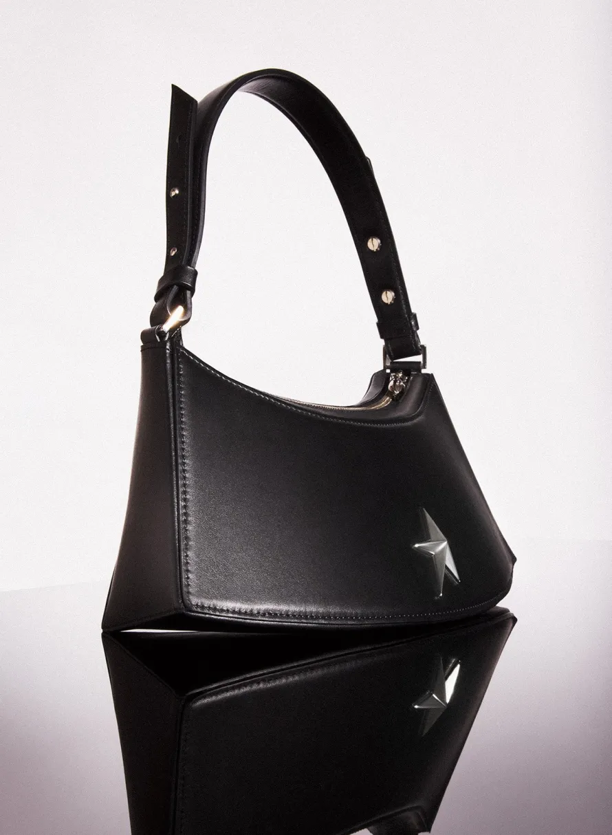 Italian leather and constructionSilver metal star hardwareZip fasteningMicrosuede lining using recycled materialInterior…