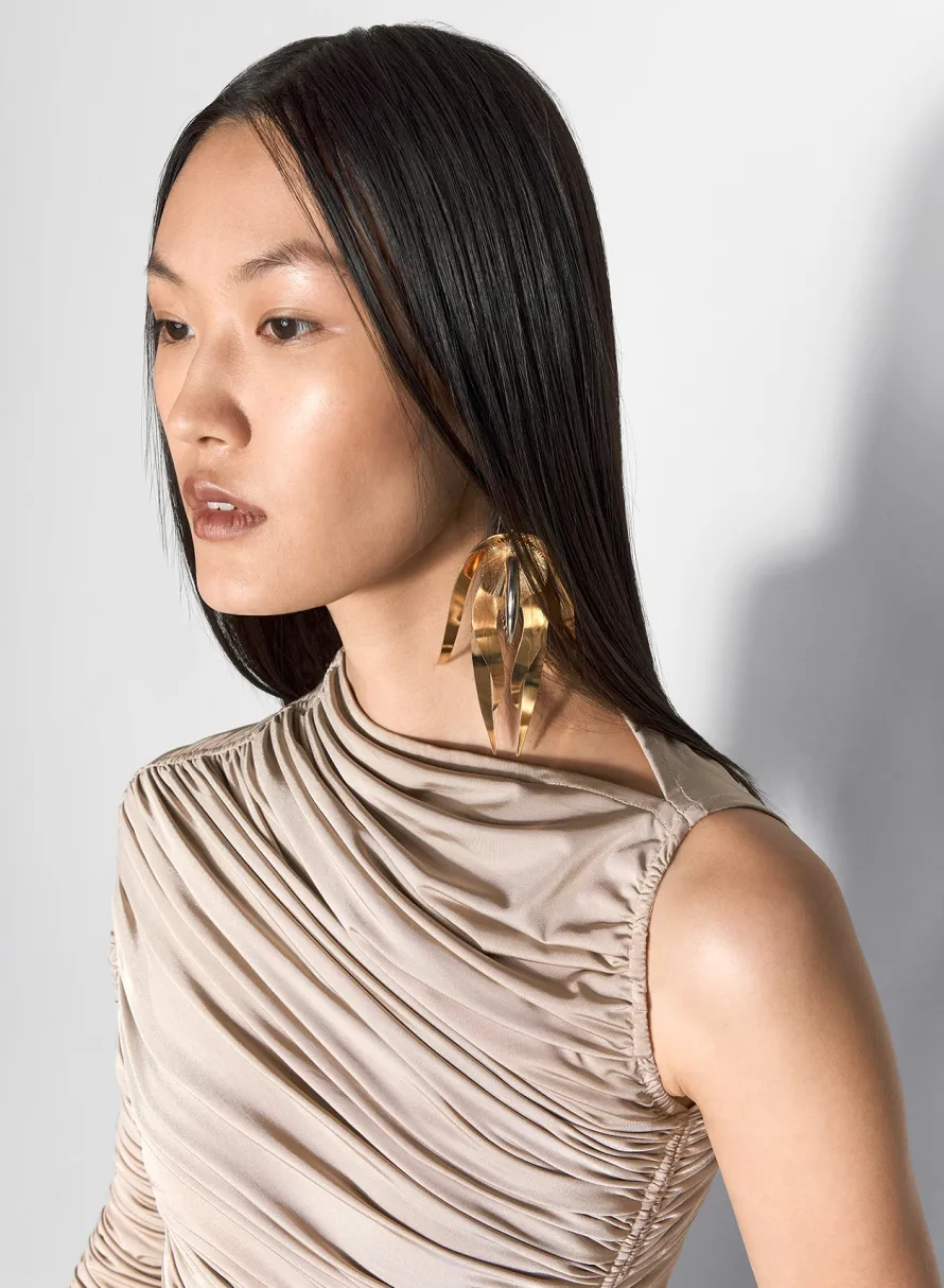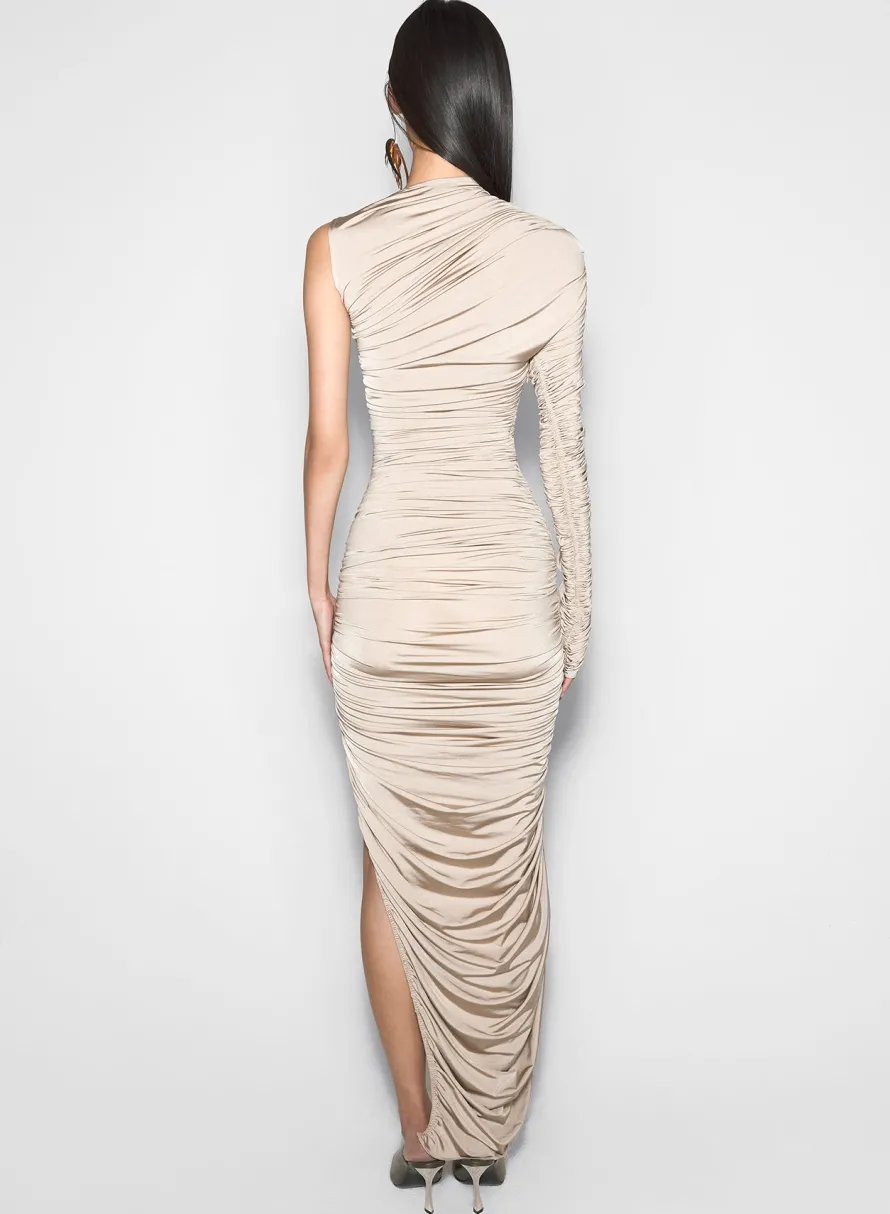 Fitted silhouetteOne-shoulder necklinedraped effectAsymmetrical hem with a thigh-high slit