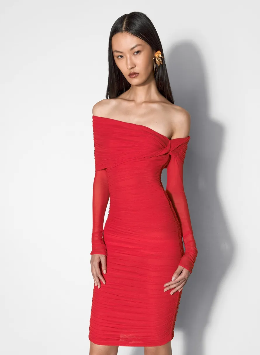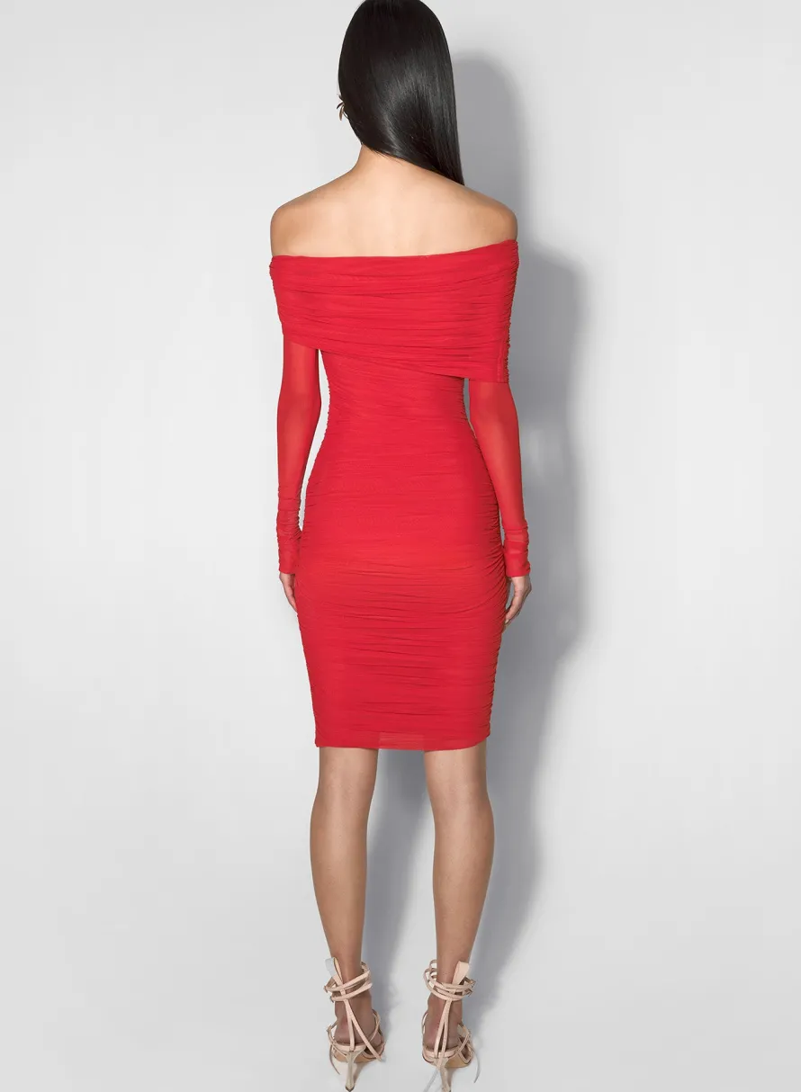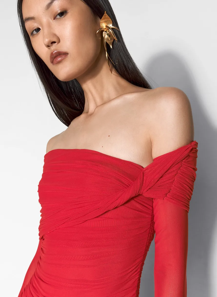 Fitted silhouetteOff-the-shoulder necklineLong sleevesSheer panel