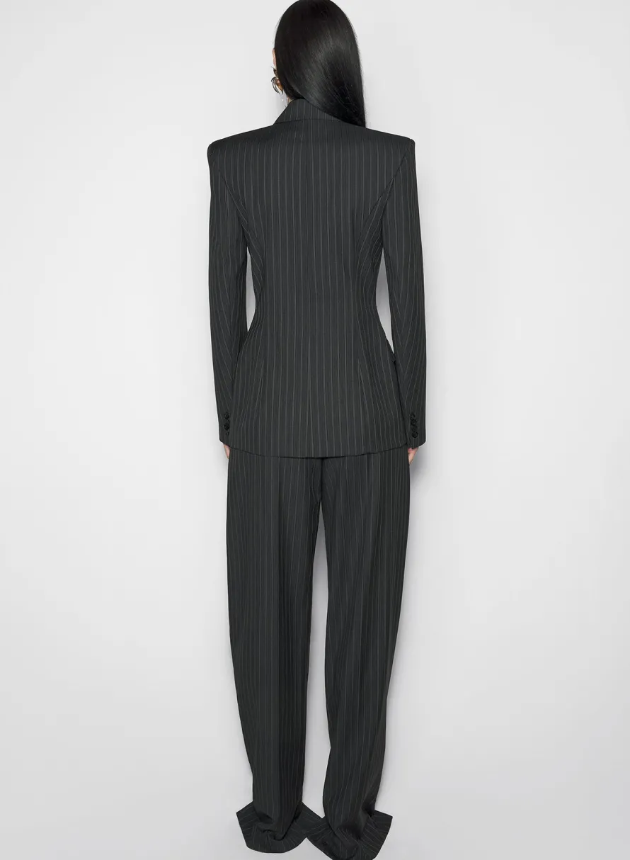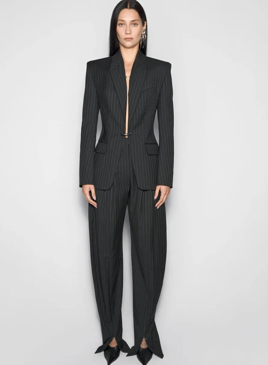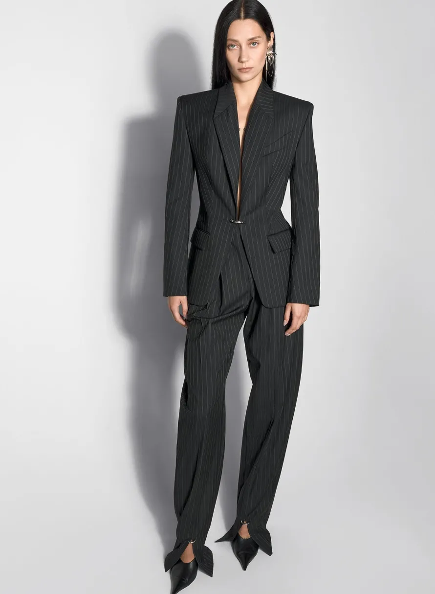 silverpierced buckleshoulder padsfitted cutpinstripe patternflap side pockets