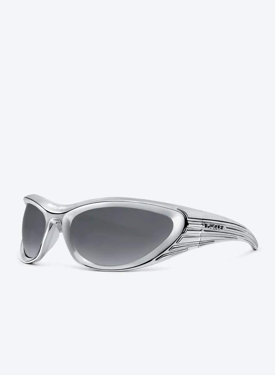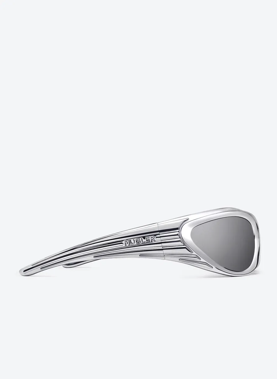 Discover the Spiral 02 CS1 from the Gentle Monster X Mugler collaborative collection. Featuring an amplified wide goggle shape, the modern chrome silver frame and gray mirror lenses add a touch of glamor. The embossed line detail and chrome logo on the temples come together to form a powerful identity while the rubber nose pads behind the frame provide comfort.