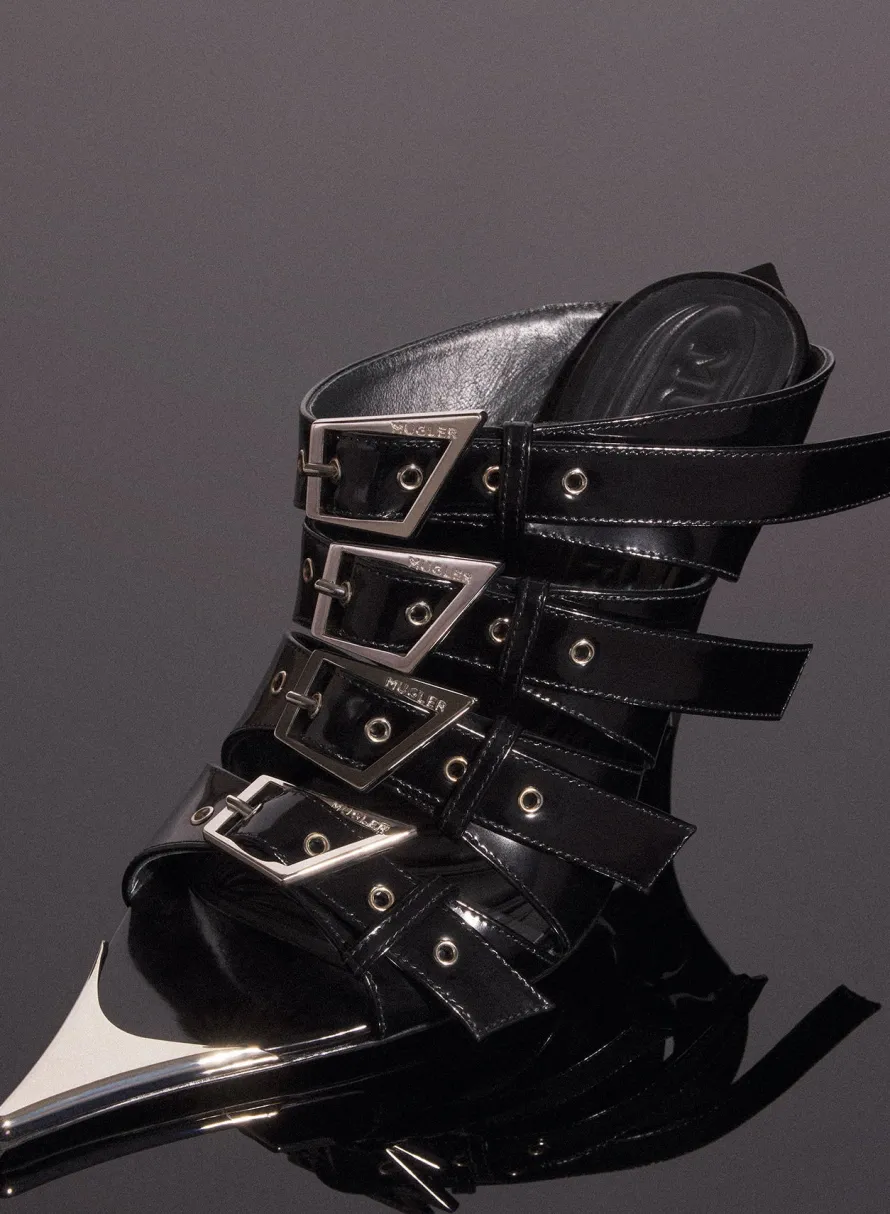 Shoes|MUGLER black shiny leather buckled fang 95 sandals